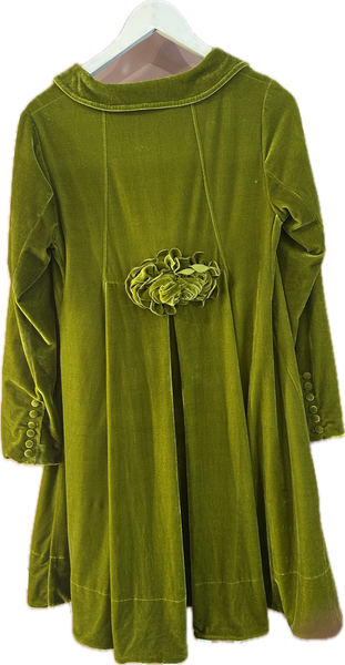 Size 10 on label, beautiful chartreuse green stretch velvet with a cabbagy rose on the back.